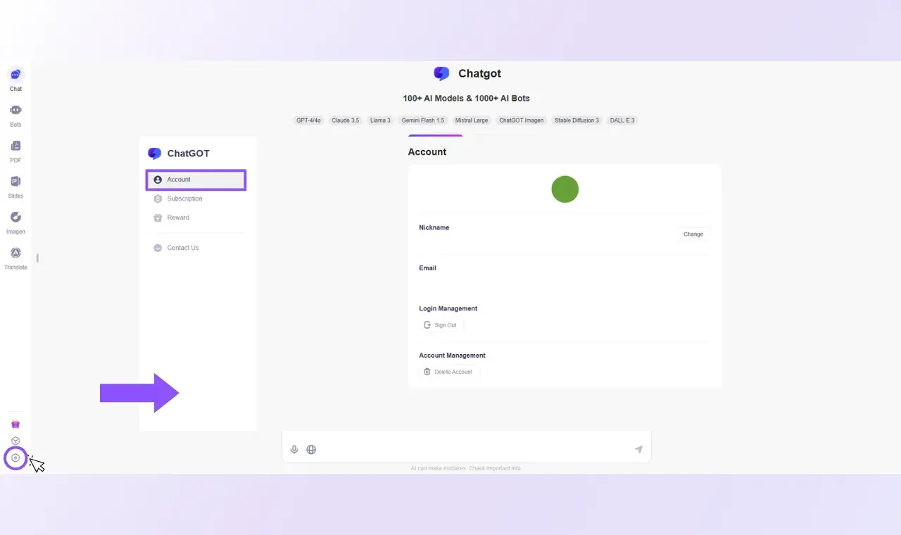 A: On the Chat page, click “Settings” in the lower left corner to access the settings-account page, where you can edit your personal information.