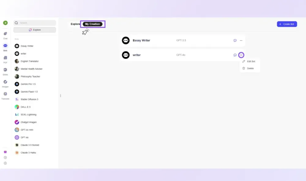 A: Click "Explore" on Bot page, then click "My Creation" to view all your bots creation history. Click the menu button on the right side of the bot to choose to delete or edit it. Refer to our Help Center for more detailed instructions about bots.