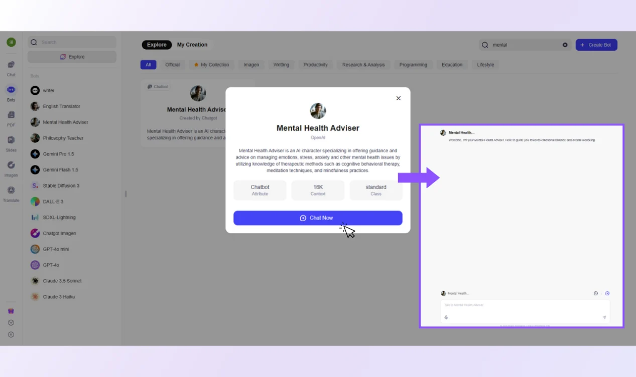 ChatGOT offers a diverse range of Bots, including Psychologist, Physics Expert, Movie Critic, and more. You can directly choose to use these existing Bots without creating a new one.