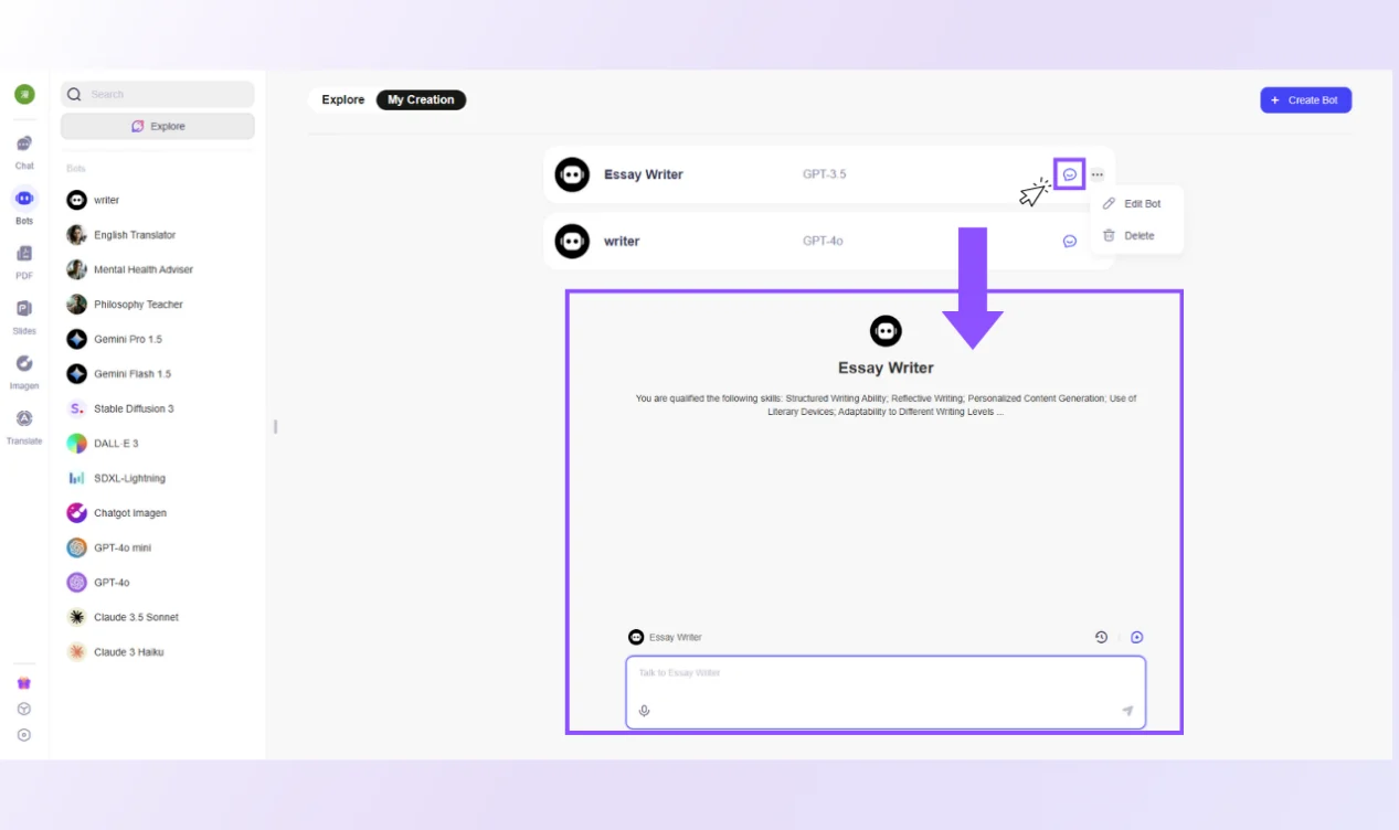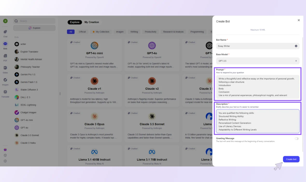 You can create and chat with bots from different AI models based on your needs. Bots can provide you with more accurate answers by selecting an AI model, setting prompts, adding skill descriptions, and more.